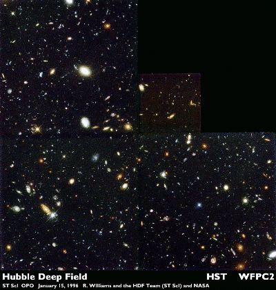 This is the original Hubble deep sky mosaic. Just another of the incredible images returned by the Hubble space telescope over the last few years. To obtain this image, the telescope was pointed to a spot of sky near the celestial north pole that contains few close stars or nearby galaxies. Then the shutter was opened for several hours for each section of the mosaic. The area of sky covered by the composite photo is that of a grain of sand held at arm's length! Other than the lack of local stars and galaxies, it is believed to be fairly typical of the universe as a whole. Almost every object in this image is a separate galaxy containing thousands of millions of stars. Visit the Hubble Telescope site to see more amazing pictures taken from Earth orbit. The Puzzle of the Missing MassOne of the persistent problems in cosmology is variously called the problem of the missing mass or the dark matter hypothesis. Essentially, the problem arises because of the observation of huge clusters of galaxies and the estimates for the age of the universe. Using the Coma cluster as an example, astronomers have been able to estimate the visible mass and velocity of the galaxies that make up the Coma cluster and, based on the age of the universe, the individual galaxies should have enough velocity to have left the cluster hundreds of millions of years ago. The observed fact that the cluster still exists requires that there be more mass in the cluster than is visible by electromagnetic radiation at all frequencies. In fact, the visible galaxies of the Coma cluster, and others that have been studied, contain only about 10% of the mass required to maintain the clusters for the known age of the universe. The search for the missing mass, the hypothesized dark matter, is ongoing. |