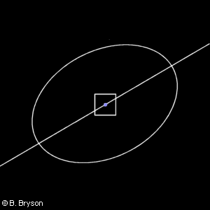 Earth and MoonAs in the last image, we see only the local volume of space around our Earth and Moon. Within this 1 million km cubed (or 1027 cubic meters) there are only the Earth with its Moon -- and a few thousand man-made satellites. The Moon's orbit is nearly 400 000 km from Earth. Earth's orbit about the Sun is indicated by the nearly straight line from upper right to lower left, while the Moon orbits counterclockwise on the ellipse. The Moon's orbit is seen as highly elliptical instead of nearly circular because we are looking from directly above San Francisco at latitude 40°N instead of above the Earth's north pole. Copyright © 2016 by Bruce Bryson |